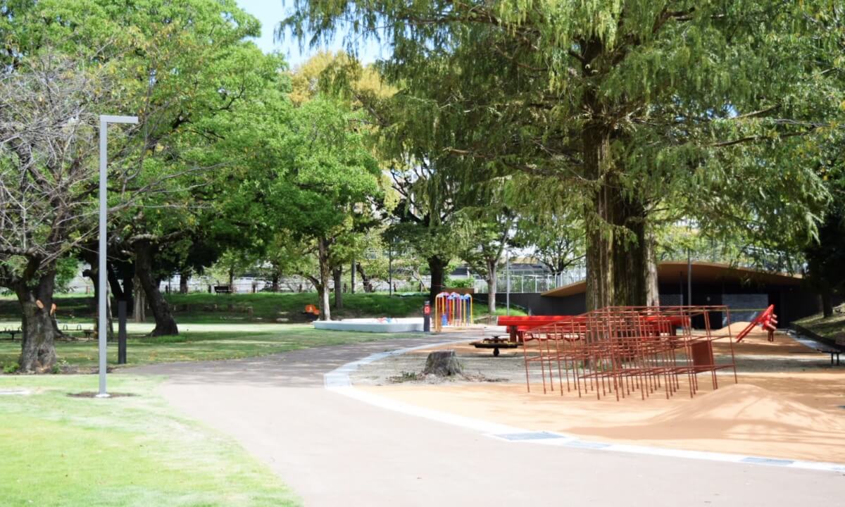 中央部の5本のメタセコイアを中心に3,500㎡を超える芝生広場を整備します。明るい林床空間として、野球場南側や山崎川沿い樹林帯における視認性や、暗い場所の改善のために低木の整備を行い、より緑に親しむことができる公園として整備します。